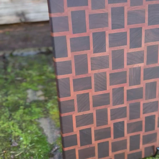 Awaken the heart of your kitchen with our Basket Weave Illusion End-Grain Cutting Board—a masterful fusion of craftsmanship and optical charm. Expertly handcrafted to blend the rich contrast of cherry and walnut, its geometric design conjures the illusion of woven texture, creating an enchanting centerpiece for prepping, serving, or displaying.