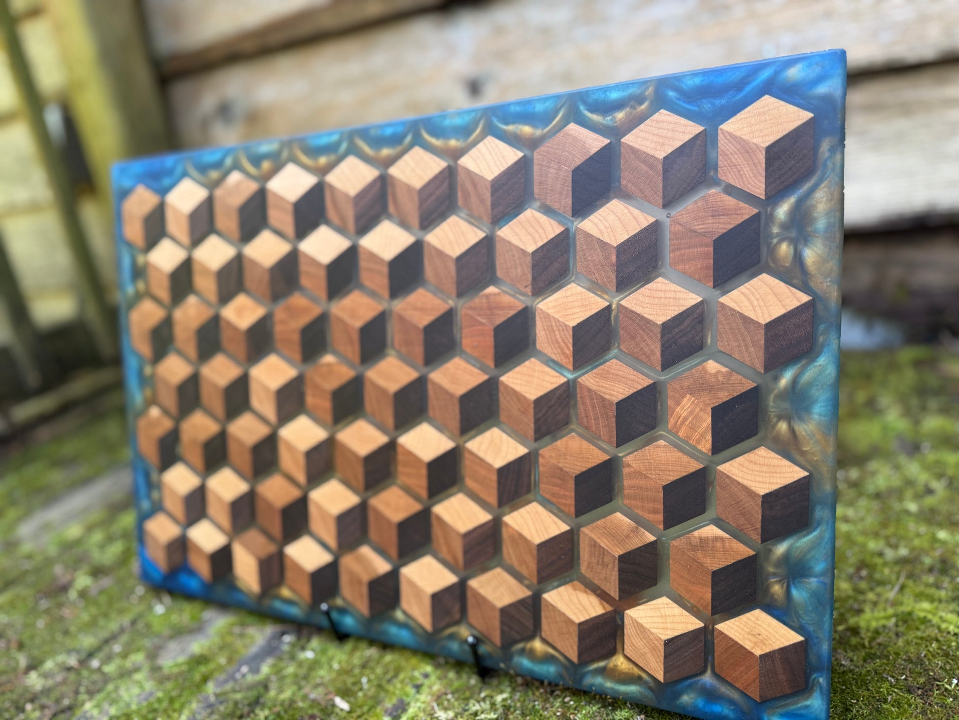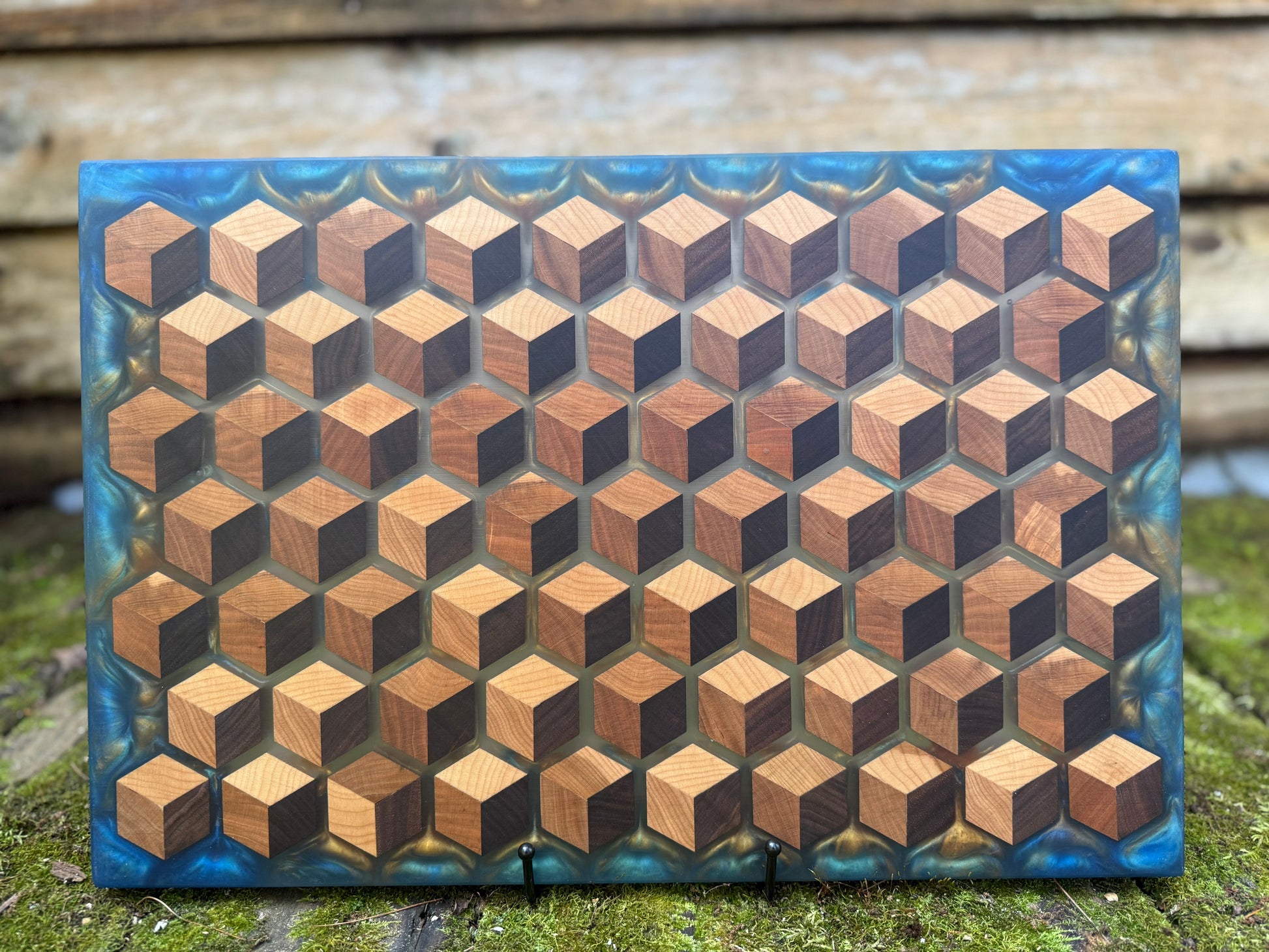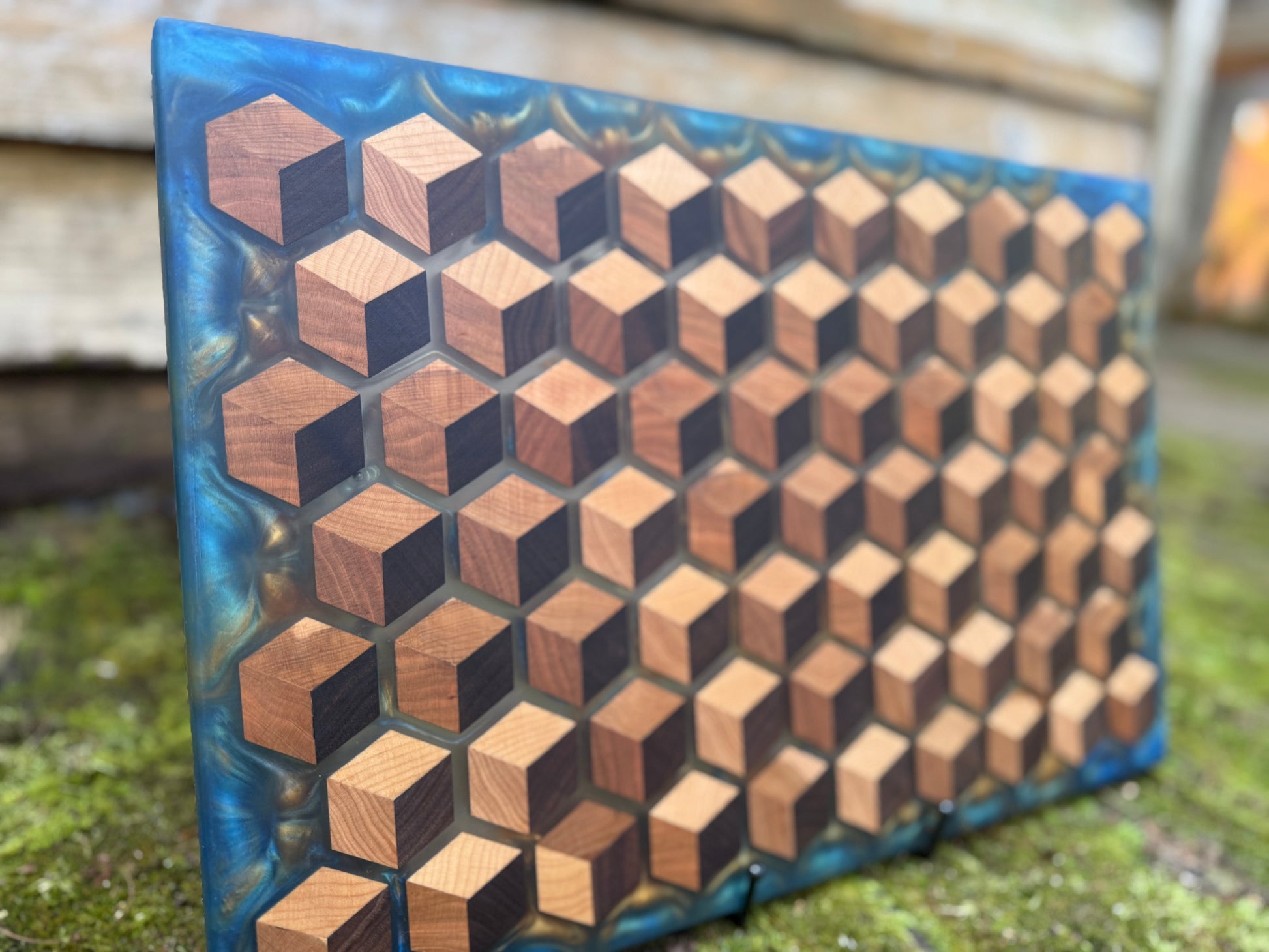 Elevate your space with the mesmerizing beauty of my Signature HoneyCubed Board. Crafted with precision, this unique piece features cubes made from rich walnut, warm cherry, and light maple, creating a captivating 3D effect that appears to float effortlessly within crystal-clear epoxy resin.