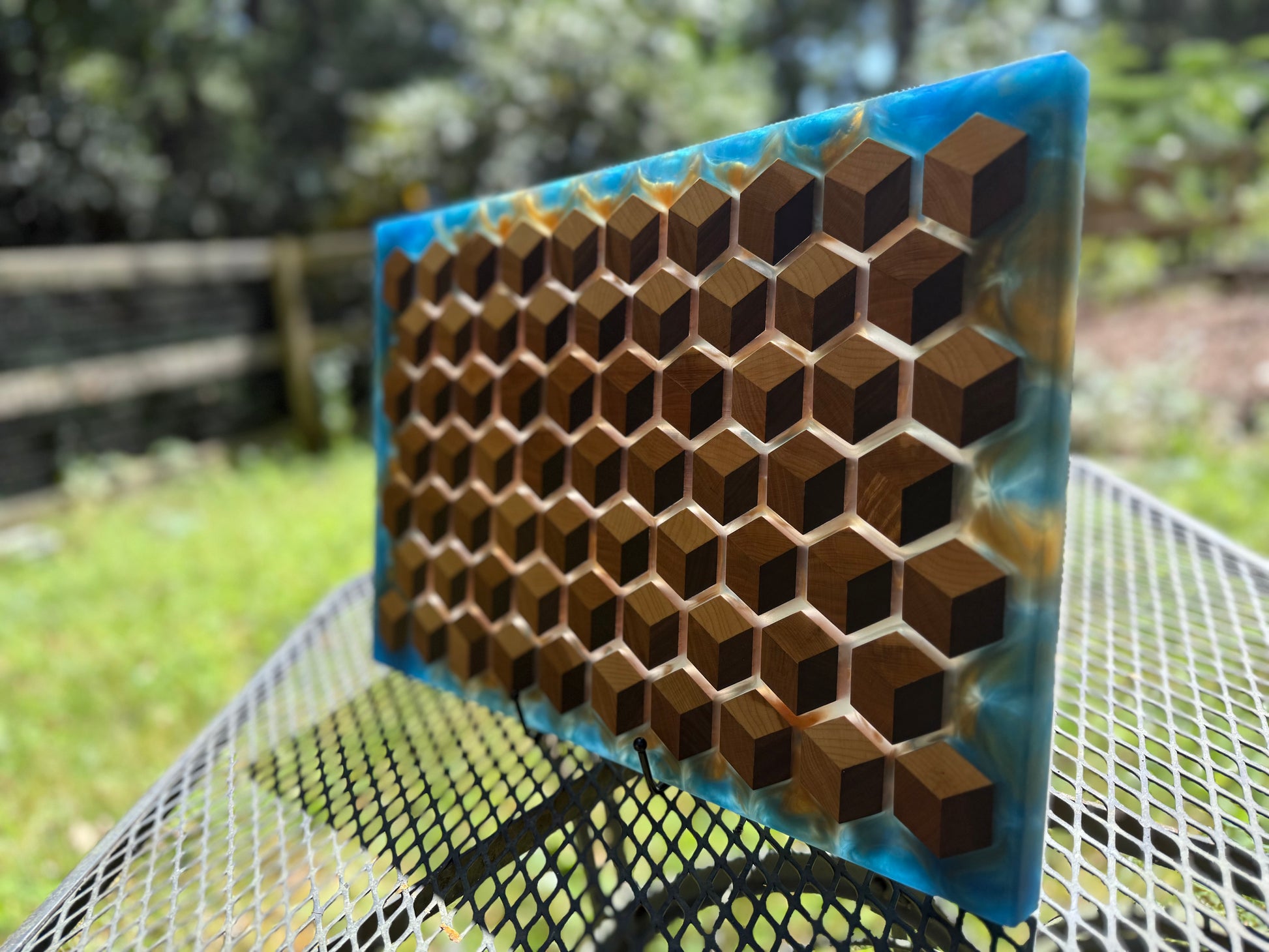 Handcrafted with care and inspired by natures geometry, the HoneyCubed Board is a testament to the artistry of fine woodworking and resin craftsmanship. A stunning centerpiece for any home or occasion.
