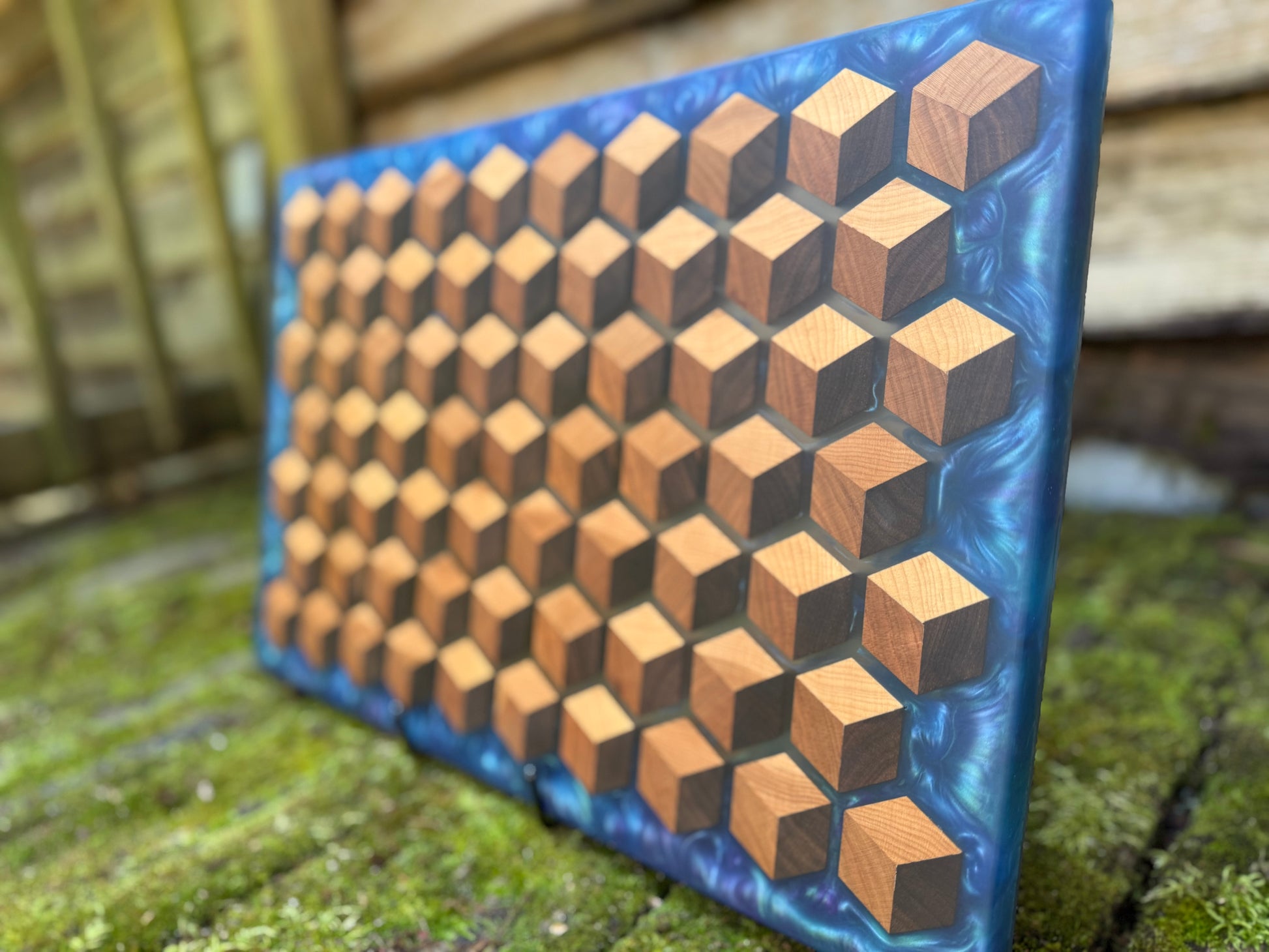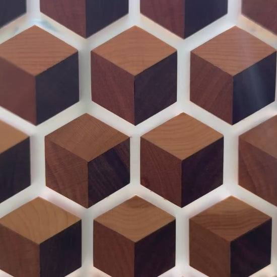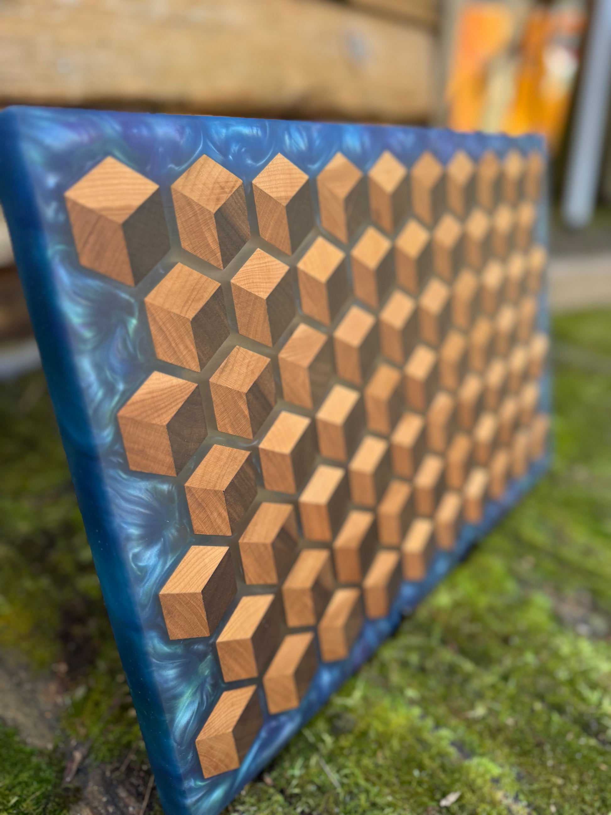 Elevate your space with the mesmerizing beauty of my Signature HoneyCubed Board. Crafted with precision, this unique piece features cubes made from rich walnut, warm cherry, and light maple, creating a captivating 3D effect that appears to float effortlessly within crystal-clear epoxy resin.